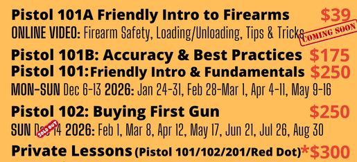 2. If you are new to guns and want a firm foundation from Day 1, take our Pistol 101: Safety & Fundamentals 4-Hour in-person course for $250. You don't need to own a gun since we provide all guns & ammo, eye and electronic ear protection for the most comfortable experience. Pistol 101-A: Friendly Intro to Firearms online video is included in the price, which you can watch from the convenience of your home before coming to class.